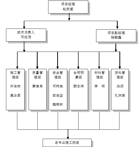 本工程挑选施工经验丰富、责任心强的人员作为施工骨干,采取项目现场组织结构进行施工组织管理,以项目负责人为首、技术负责人为辅,下设施工管理部、资料结算部、质安部、材料部等。