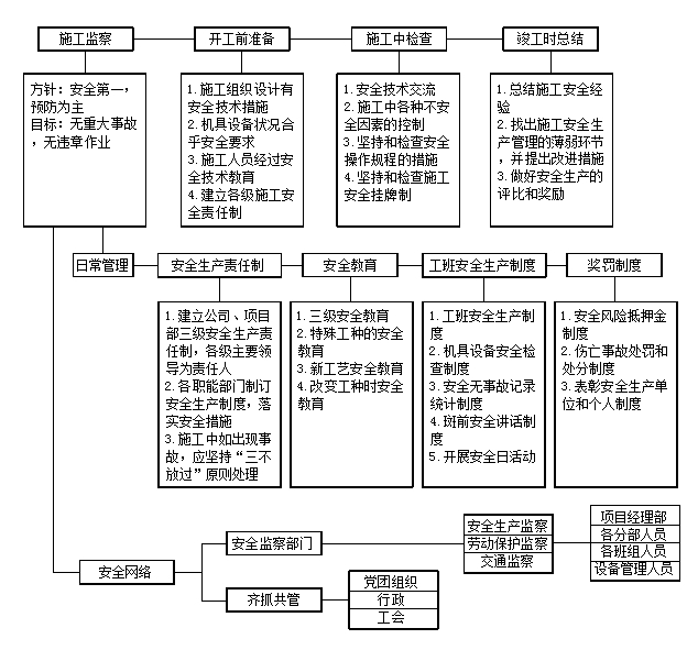 1、在施工中贯彻“安全第一,预防为主”和坚持“管生产必须管安全”的原则,加强对安全生产的领导工作,增强职工安全生产的法制观念,并认真组织贯彻落实本公司制定的各项管理制度。