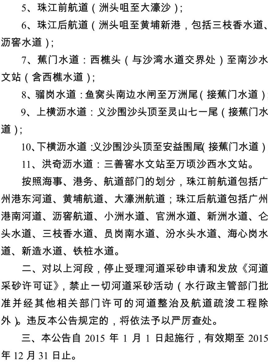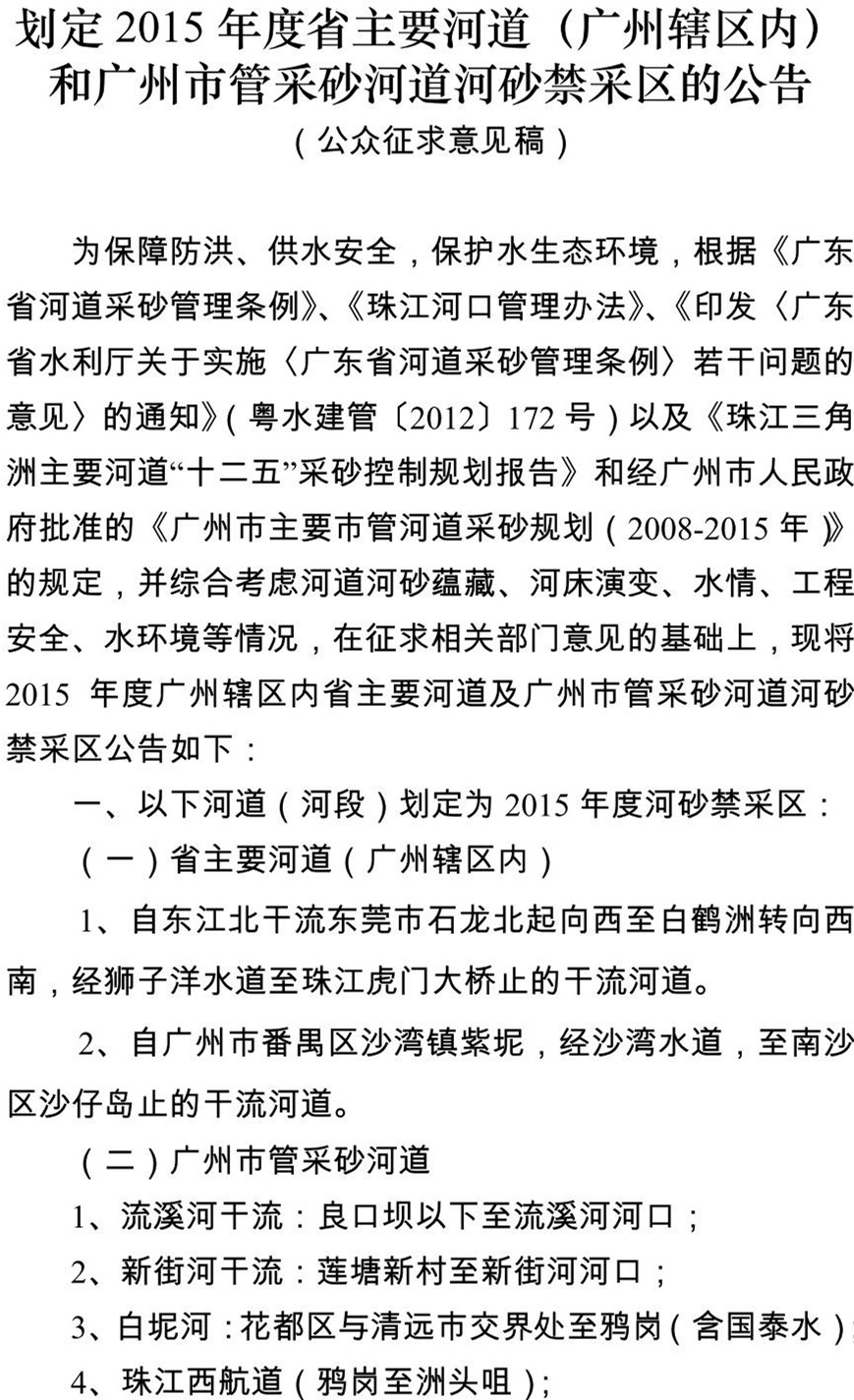 另附“关于划定省主要河道(广州辖区内)和广州市市管采砂河道2015年度河砂禁采区的公告(公众征求意见稿)”如下: